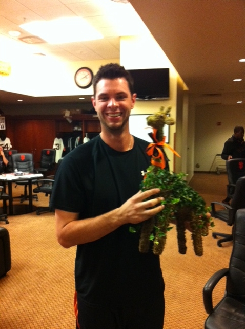 I drove to the Fresno ballpark to gather my baseball stuff – about a dozen bats, batting gloves and four fielding gloves (three first-baseman gloves and one outfielder’s glove). Then I went back home, packed my clothes and tried to get a couple hours’ sleep. The car that was supposed to pick us up broke down, so the Giants’ travel coordinator Mike Scardino hopped in his own car at about 3 in the morning and got to Fresno around 6:30. Then he turned around and drove back, delivering us to AT&T around 10.